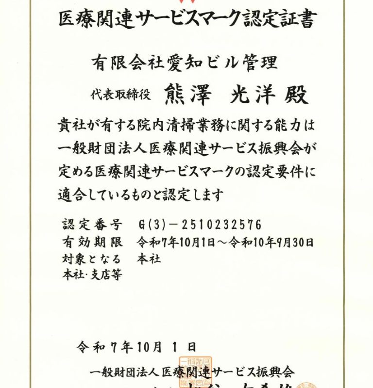 Home 2 清掃管理業務 日常清掃、定期清掃、特別清掃をはじめ、高品質で低コストな清掃サービスをご提供します。 VIEW MORE 医療施設清掃業務 37年間のクリニック・病院清掃のノウハウと品質第一主義の技術で、院内に快適と安心をお届けします。 VIEW MORE 衛生管理・設備管理業務 衛生管理、設備管理を一括で請け負い、日々の安心と企業の法令順守をサポートします。 VIEW MORE introducing 愛知ビル管理は医療関連サービスマーク認定企業です 弊社は創業以来37年以上にわたり医療機関への清掃サービスを提供してまいりました。今般、その実績の中で培われた清掃技術と管理体制をより厳格に体系化し、「医療関連サービスマーク[院内清掃業務]」の認定を取得するに至りました。 医療関連サービスマーク認定とは医療関連サービスの質の確保を図り、その健全な育成・発展を図ることを目的として、第三者機関から3年に1度、サービスの品質が水準に適合しているかどうかの審査を受け、それをクリアした企業だけが認定されるというものです。簡単に言うと認定企業であれば「医療関連サービスを行う上で、十分に高い品質を維持できている」という証明になります。クリニック・病院の清掃なら愛知ビル管理に全てお任せください。 有限会社愛知ビル管理 令和4年10月医療関連サービスマーク(院内清掃)更新 G(2)-2210232576 NEWS&BLOG 新着NEWS&ブログ 1010月2025 微妙な気温 Author aichibirukanri 秋きたかなって思いましたが、全然30度近い日もありますね。 多分、... 210月2025 医療関連サービスマーク Author aichibirukanri 8月頃に審査があった医療関連サービスマーク認定ですが、 無事に認定... 259月2025 秋きた? Author aichibirukanri かなり涼しくなりましたね。 この先の天気予報を見ても、30度超えは... 199月2025 Instagram Author aichibirukanri 以前にも紹介しましたが、当社にはInstagramのアカウントがあります。 月... our services サービス案内 私たちのご提供するサービスの一番の強みは、クリニック・病院の業務で培った「品質の高さ」と多くの実績から得たノウハウによって最適化された「コストバランス」です。 清掃管理業務 日常清掃、定期清掃、特別清掃をはじめ、高品質で低コストな清掃サービスをご提供します。 READ MORE 医療施設清掃業務 37年間のクリニック・病院清掃のノウハウと品質第一主義の技術で、院内に快適と安心をお届けします。 READ MORE 衛生管理・設備管理業務 衛生管理、設備管理・保守を一括で請け負い、日々の安心と企業の法令順守をサポートします。 READ MORE CONTRACT RESULTS 受託実績 37年の実績と信頼はお客様と愛知ビル管理が歩んできた軌跡です。 今後もお客様に感動していただける仕事を目指し邁進して参ります。 受託実績一覧へ 医療施設 top_category 調剤薬局・ドラッグストア top_category 老人福祉施設・介護施設 top_category テナントビル・賃貸マンション top_category 事務所・オフィス top_category 商業施設・店舗 top_category その他・公共事業 top_category その他・公共事業 top_category 商業施設・店舗 top_category 事務所・オフィス top_category テナントビル・賃貸マンション top_category 老人福祉施設・介護施設 top_category 調剤薬局・ドラッグストア top_category Need a Doctor for Check-up? Just make an Appointment & You’re Done! Get Your Quote or Call: (0080) 123-453-789 GET AN APPOINTMENT 201 Award Shows 354 Qualified Staff 528 Hospital Rooms 124 Machines まずはお客様のお話をお聞かせください 愛知ビル管理が責任を持ってお客様をサポートいたします 会社案内 Make an Appointment アポイントメント 下記内容を記入し、送信いただければ弊社サービス担当より折り返しお電話差し上げます(通常3営業日以内にご連絡いたします) 会社名※必須 担当者※必須 電話番号※必須 お電話ご希望時間帯※必須 お問合わせ内容※必須