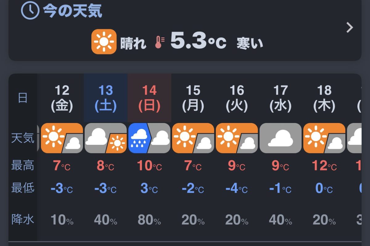 しばらく先の予報を見ると雪マークもついていました。